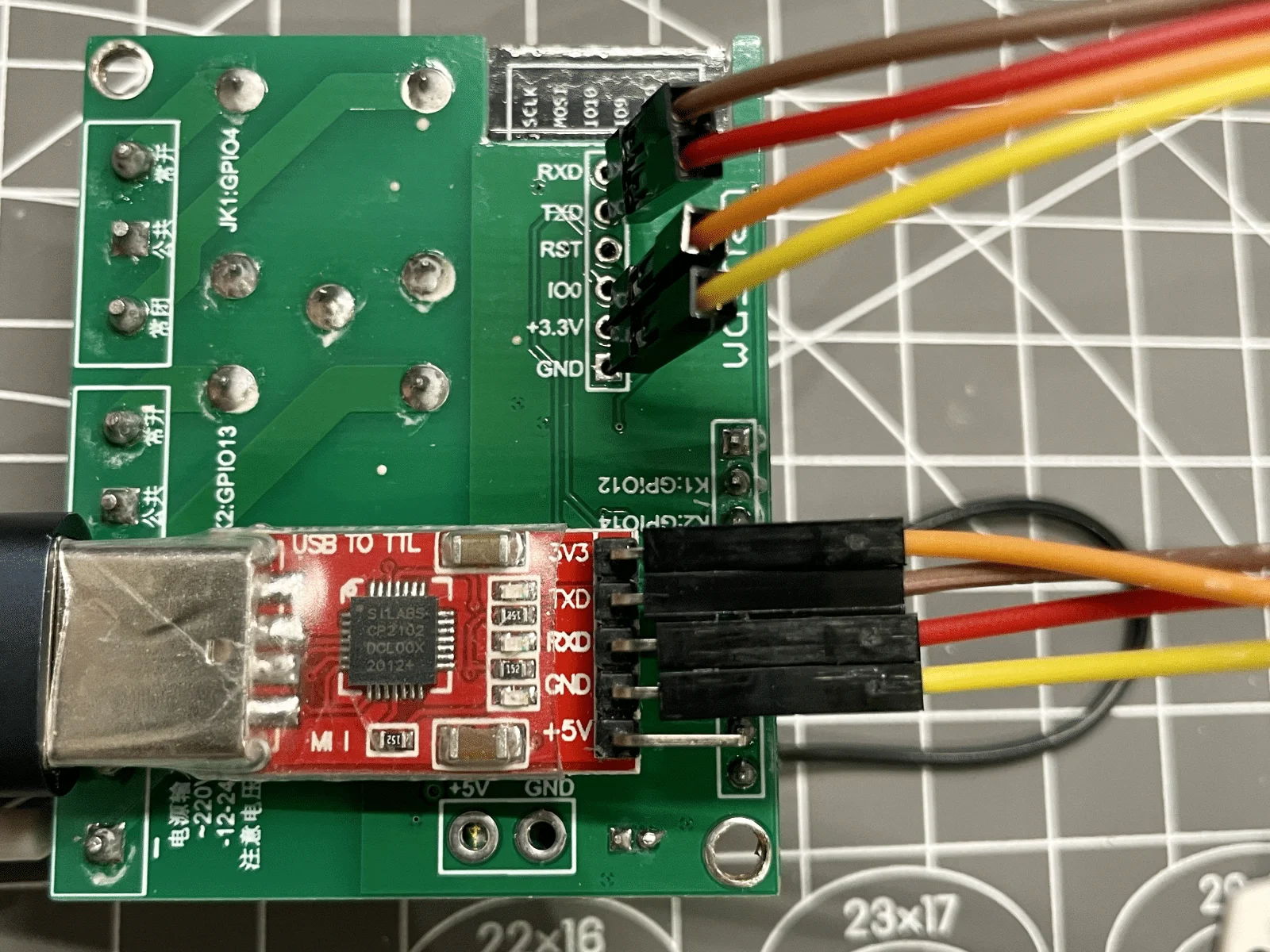 使用杜邦线短接GPIO0和GND引脚,使ESP8266上电时启动为烧录模式;连接USB-TTL转换器与模块串口,如下图。