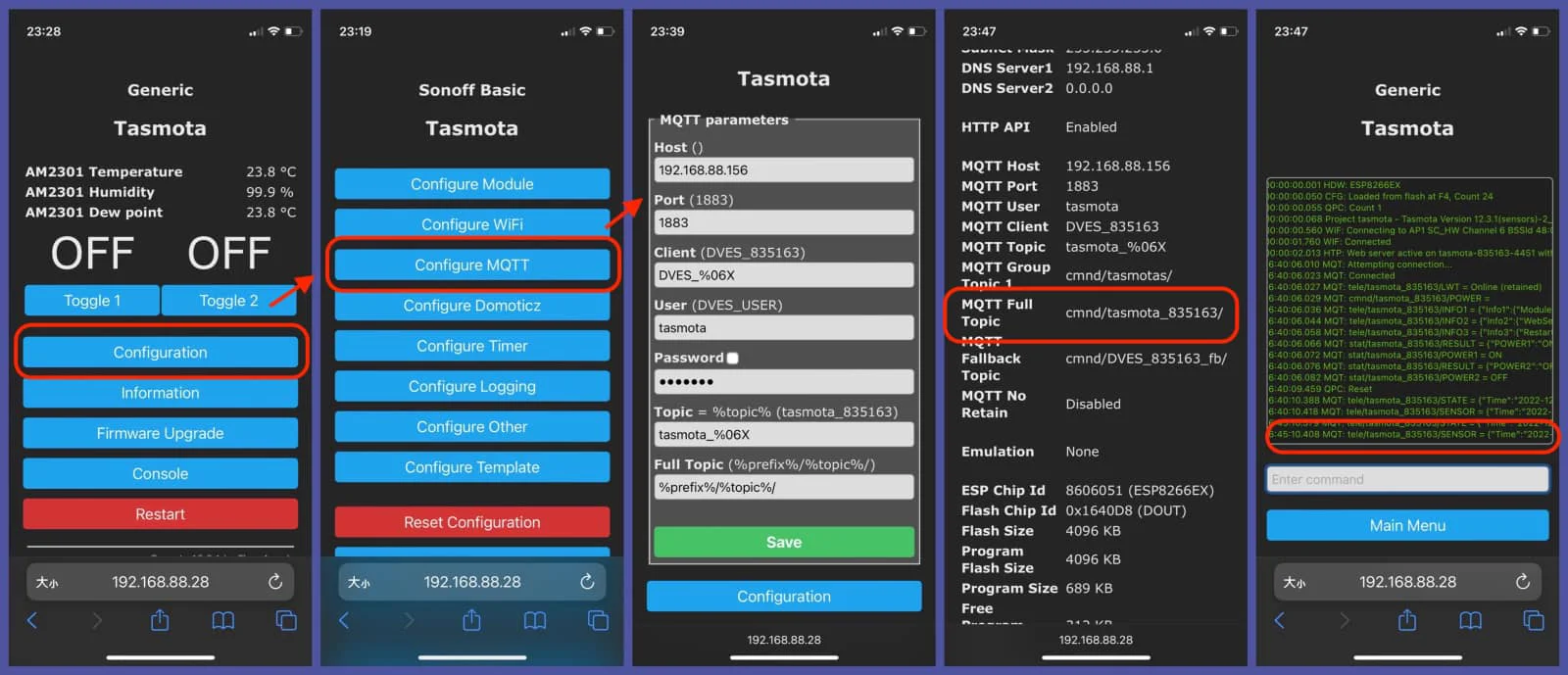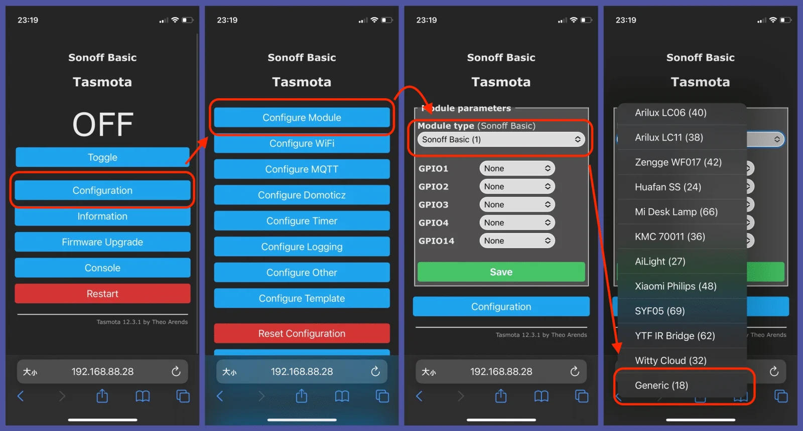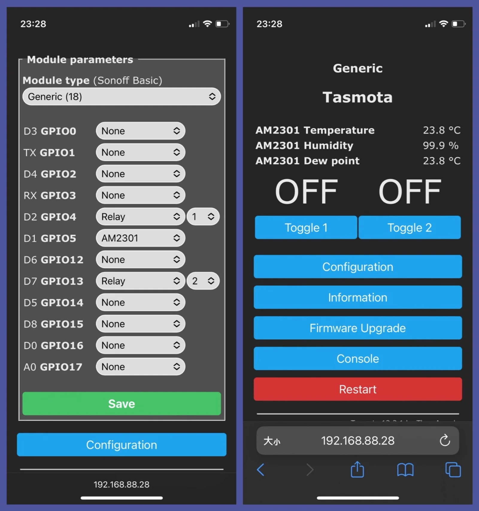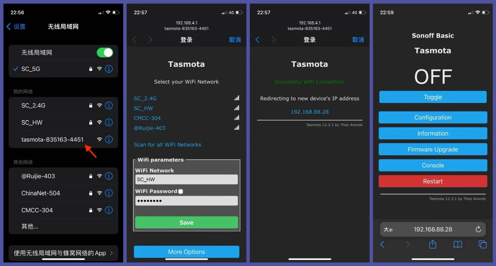 移除GPIO0和GND引脚之间的短接线,重新上电。如下图,Tasmota会生成一个名称为tasmota-xxxxxx-xxxx的热点,手机连上该热点后,访问192.168.4.1(有些手机会自动跳转),选择你家WIFI的SSID,并在Wifi parameters卡片内输入WiFi密码,点击Save保存。稍等片刻,跳转页面提示Successful WiFi Connection,并在下方显示该设备获取的IP地址,我这里是192.168.88.28。手机切换回原WiFi,访问设备IP即可进入设备配置页面。