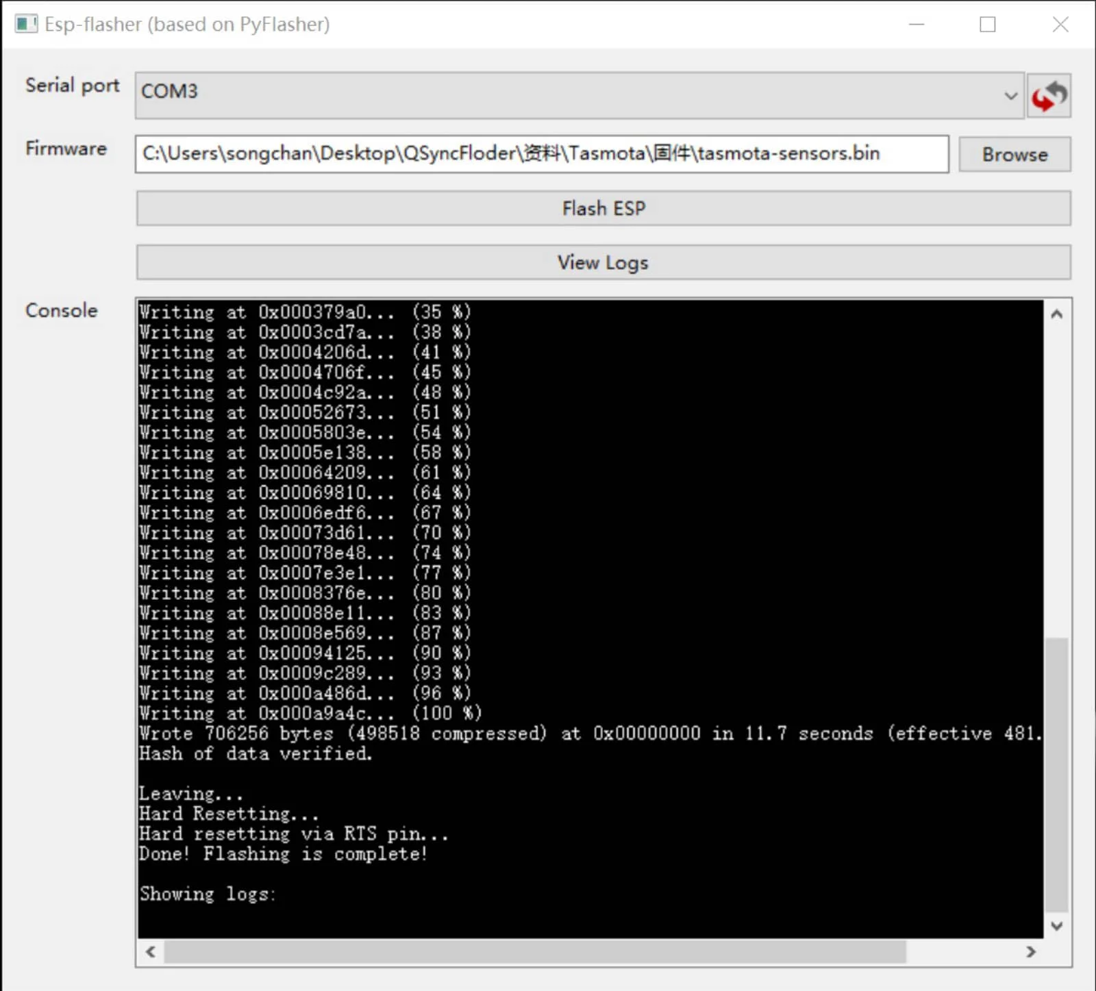 以管理员权限运行ESP_Flasher.exe软件,选择USB-TTL对应的COM口,载入步骤1下载的固件,点击Flash ESP按钮,此时Console窗口内应该有日志输出,直到显示Done!Flashing is complete!,如下图,代表已经烧录成功。