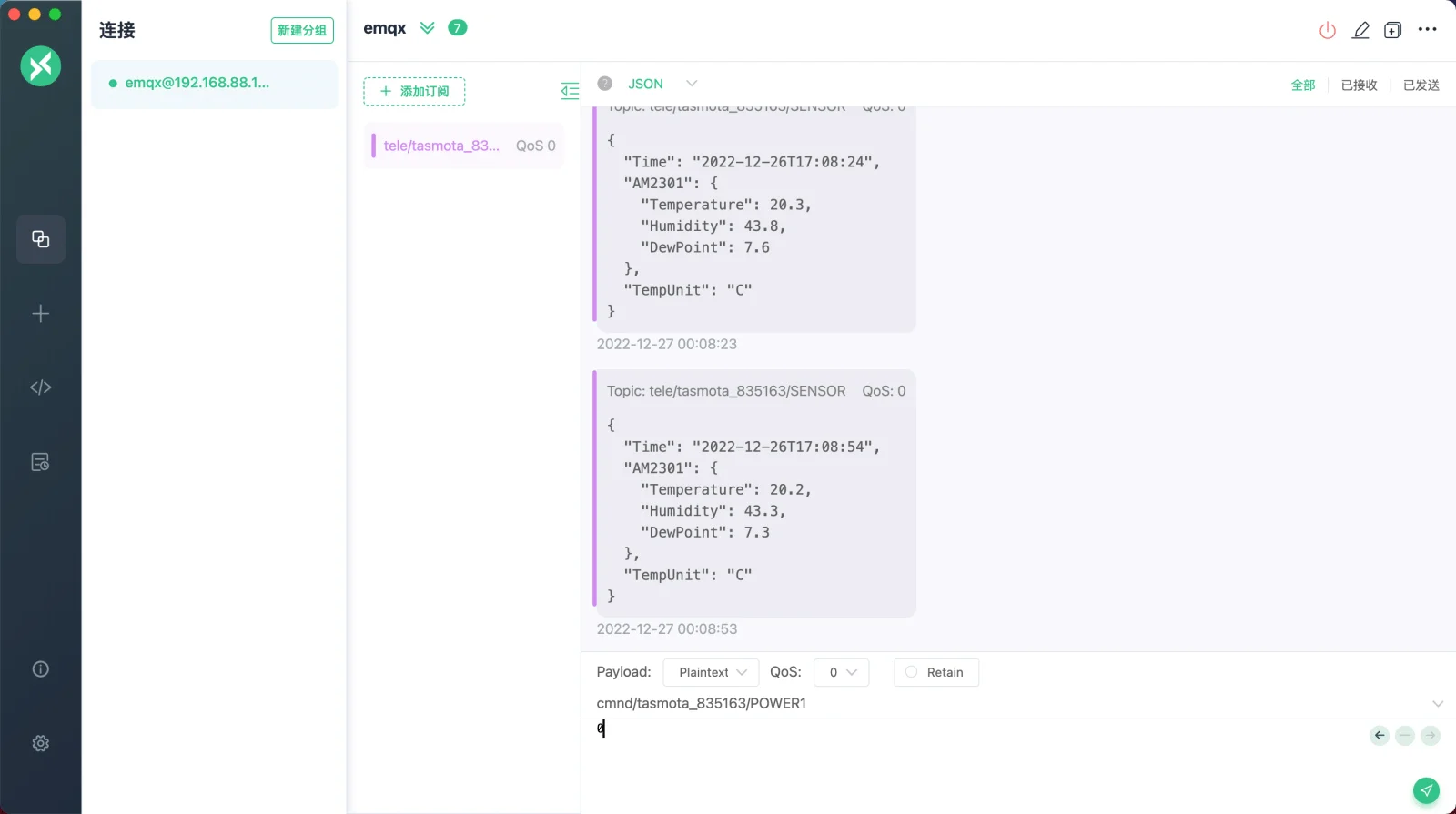 下面来试一下使用MQTT客户端控制继电器开关,向cmnd/tasmota_835163/POWER1主题发送(Plaintext)数据1 或 ON,即可接通继电器,发送0 或 OFF即可断开继电器;向cmnd/tasmota_835163/TelePeriod主题发送数据30,可以将数据上报间隔设置为30秒;订阅tele/tasmota_835163/SENSOR主题可以接受设备上报的温湿度数据。